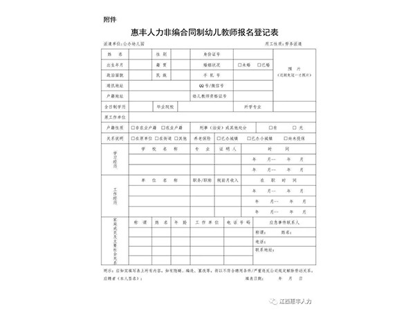 為滿足我市公辦幼兒園師資需求,我公司面向社會公開招聘一大批非事業(yè)編合同制幼兒教師,以勞務派遣的方式與用人單位進行勞動力資源開發(fā)合作?,F將有關事項公告如下:一、招聘人數及崗位我市招聘非事業(yè)編合同制幼兒教師50名,具體崗位在選崗前公示。二、招聘方式通過第三方勞務公...