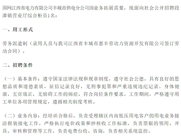 國網江西省電力有限公司豐城市供電分公司因業(yè)務拓展需要,現面向社會公開招聘段潭鎮(zhèn)營業(yè)廳綜合柜員1名:一、用工形式勞務派遣制(錄用人員與我司江西省豐城市惠豐勞動力資源開發(fā)有限公司簽訂勞動合同)。二、招聘條件(一)基本條件:遵守國家法律法規(guī)和規(guī)章制度,遵守社會公德,...