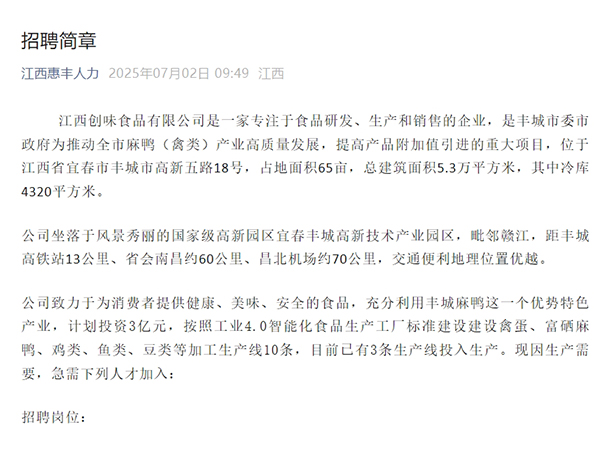 江西創(chuàng)味食品有限公司是一家專注于食品研發(fā)、生產和銷售的企業(yè),是豐城市委市政府為推動全市麻鴨(禽類)產業(yè)高質量發(fā)展,提高產品附加值引進的重大項目,位于江西省宜春市豐城市高新五路18號,占地面積65畝,總建筑面積5.3萬平方米,其中冷庫4320平方米。公司坐落于風...